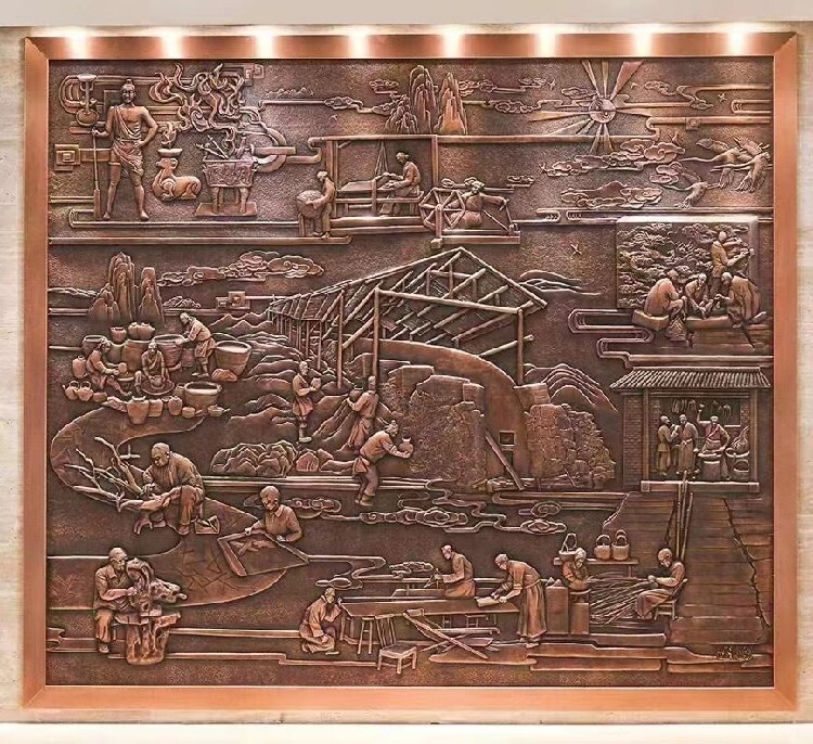 3.銅板加熱(沒經(jīng)過一次鍛造都需要進(jìn)行銅板加熱進(jìn)行軟化,經(jīng)過捶打后銅板會(huì)變得堅(jiān)硬,需要反復(fù)的進(jìn)行鍛造、加熱,不斷地重復(fù)這一過程,得到終的鍛銅浮雕,圓雕)