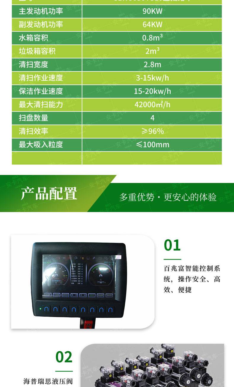 不銹鋼垃圾箱、清水箱,液壓油泵采用意大利原裝進(jìn)口,使用壽命長,穩(wěn)定可靠,故障率低;液壓閥采用德國進(jìn)口電磁閥;液壓管路采用德國標(biāo)準(zhǔn)技術(shù)密封結(jié)構(gòu)形式,抗震動性好,密封可靠性高,可實(shí)現(xiàn)無泄露的密封效果;關(guān)鍵電控元件采用法國施耐德技術(shù)。清掃系統(tǒng)由副發(fā)動機(jī)提供動力,不干涉整車動力。操縱箱在駕駛室,各系統(tǒng)電氣集中控制,操作方便。外觀造型電腦設(shè)計(jì),高位側(cè)裙,曲面過渡,整體協(xié)調(diào)勻稱;本車由底盤,副發(fā)動機(jī),風(fēng)機(jī),電磁控制閥,垃圾箱,水箱,吸盤,掃把,噴水系統(tǒng),液壓系統(tǒng),電控系統(tǒng)等組成。廠家提供掃路刷。