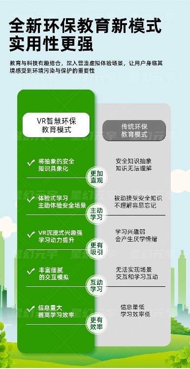 VR環(huán)保學(xué)習(xí)機(jī)有五大環(huán)保課程模塊選擇,以生動、形象、互動的方式傳遞環(huán)保知識,激發(fā)用戶對自然環(huán)境的熱愛和保護(hù)意識。同時,這款學(xué)習(xí)機(jī)還具備實時反饋和個性化學(xué)習(xí)等功能,能夠幫助用戶樹立正確的環(huán)保行為習(xí)慣,培養(yǎng)他們的實踐能力和創(chuàng)新思維。通過家庭、學(xué)校、社會多方共育模式,VR環(huán)保科普學(xué)習(xí)機(jī)有望成為普及環(huán)保知識、提高全民環(huán)保意識的重要工具。